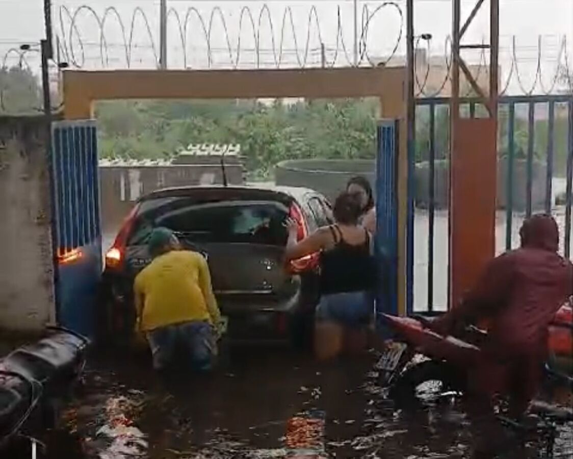 Durante a tempestade, professores e funcionários chegaram a se arriscar para impedir que um carro fosse arrastado pela água. A água suja invadiu o pátio da instituição.