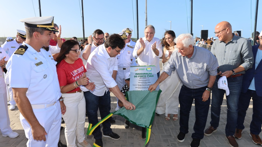 Ao lado de oficiais da Marinha do Brasil e autoridades políticas, o governador Rafael Fonteles (PT-PI) realizou o descerramento da placa inaugural do Porto Piauí na tarde desta quarta-feira (13), dando início a programação da cerimônia de inauguração da primeira etapa da obra. Em seguida, o chefe do executivo estadual demonstrou que a foz do Rio Igaraçu passou por importantes obras de dragagem para receber navios de grande porte da Marinha do Brasil. Em uma embarcação menor, Rafael se deslocou para o IGUATEMI G151, que navega pelo canal de acesso marítimo.