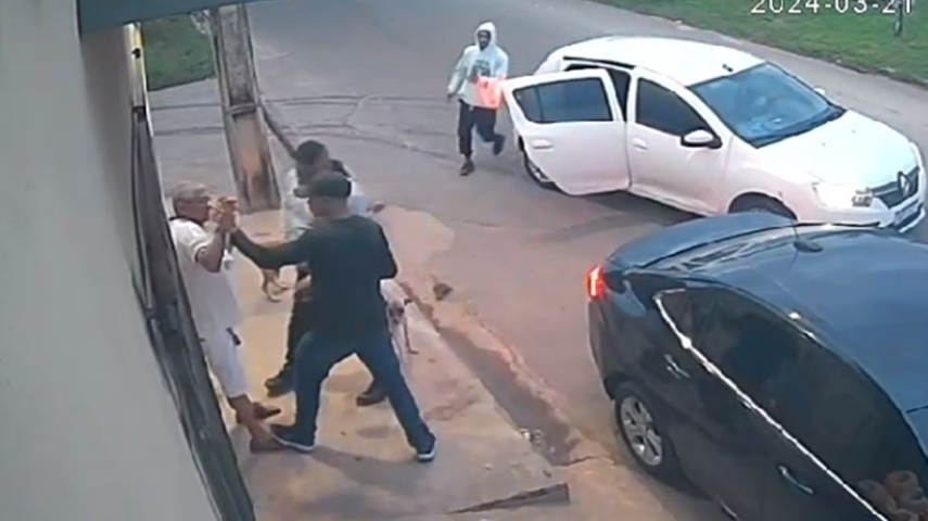 O vídeo mostra a vítima estacionando o veículo em frente ao seu estabelecimento comercial. O empresário sai do carro e passa a interagir com três cachorros que estão na rua. Nesse momento, um carro, modelo Sandero, aparece pela rua lateral e para próximo à vítima.