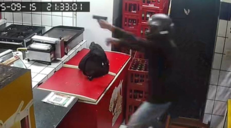 As imagens mostram quando um suspeito adentra o local e mira uma arma de fogo em direção ao proprietário. A ação durou poucos minutos.