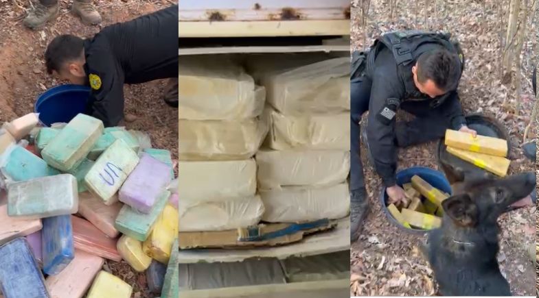 Em outra gravação, policiais retiram vários pacotes de entorpecentes de um tambor enterrado em uma área de mata, encontrado com ajuda de um cão farejador. Um dos agentes chegou a descer no buraco para alcançar o material.