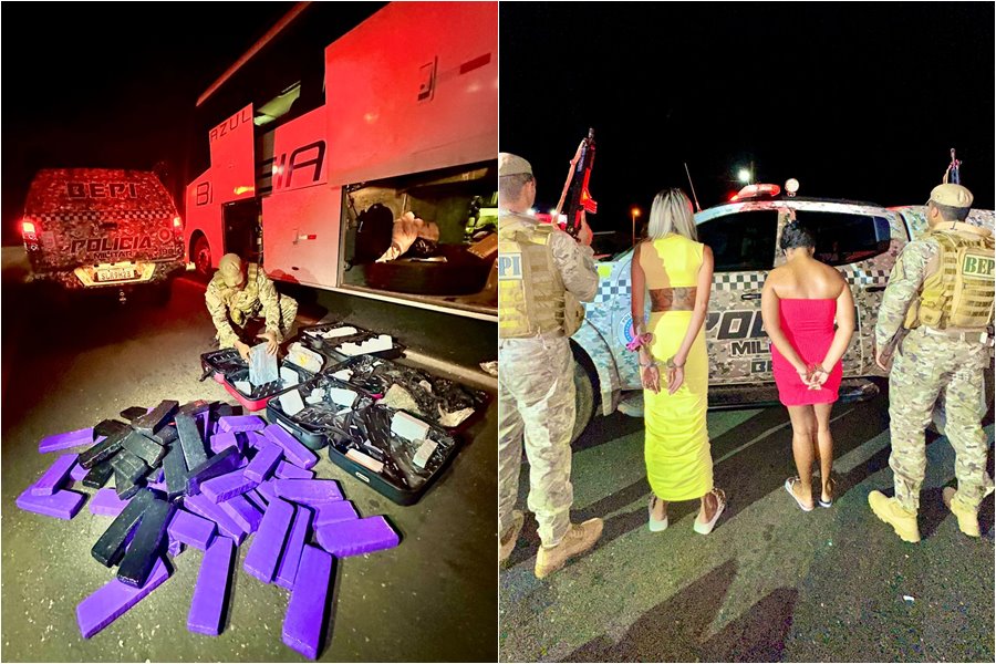 Durante as abordagens realizadas na rodovia, duas jovens foram detidas: B.B.D.N., de 20 anos, e A.D.A.R., de 18 anos. Com elas, foram encontradas duas malas, uma verde e outra rosa, contendo os entorpecentes. Além das drogas, também foram apreendidos dois aparelhos celulares e duas sacolas de roupas.