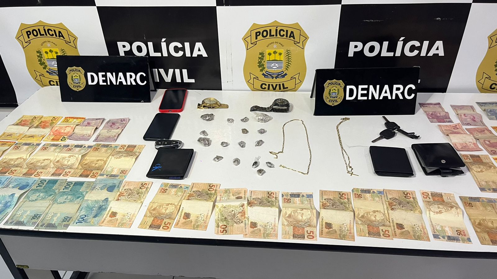 Conforme o DENARC, foram apreendidos o veículo modelo Onix de cor prata, uma quantia em dinheiro, invólucros de maconha, relógios, colares dourados e celulares.