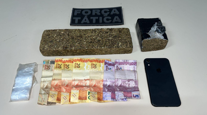 Com eles, foram encontrados tabletes de substância análoga à maconha e uma quantia em dinheiro.