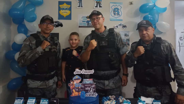 Elaine Moura, tia da criança, explicou que João Emanuel é fã de tudo que envolve o meio militar. Quando ela perguntou para ele o que queria de presente, ele disse que queria o aniversário de polícia. Com isso, a família organizou o tema da festa, mas faltava o principal: os policiais.