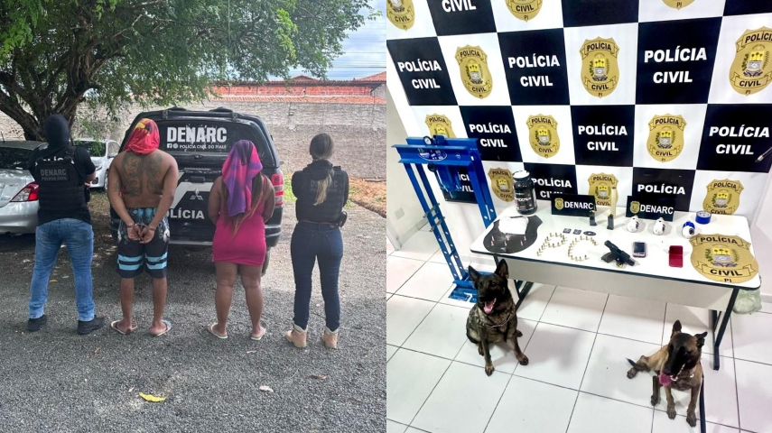 Durante a operação no imóvel, um casal foi preso em flagrante em posse de invólucros de substância análoga à cocaína e à maconha, uma pistola 9 mm, 30 munições do mesmo calibre, uma prensa hidráulica utilizada para prensar entorpecentes e papel filme utilizado para embalar os entorpecentes.