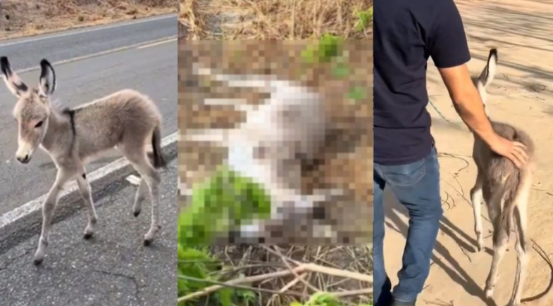 Um vídeo que circula nas redes sociais desde domingo (16) tem emocionado internautas ao mostrar um filhote de jumento sendo resgatado por dois homens após a mãe dele ser encontrada sem vida às margens da PI-140, na região de Floriano, Sul do Piauí.