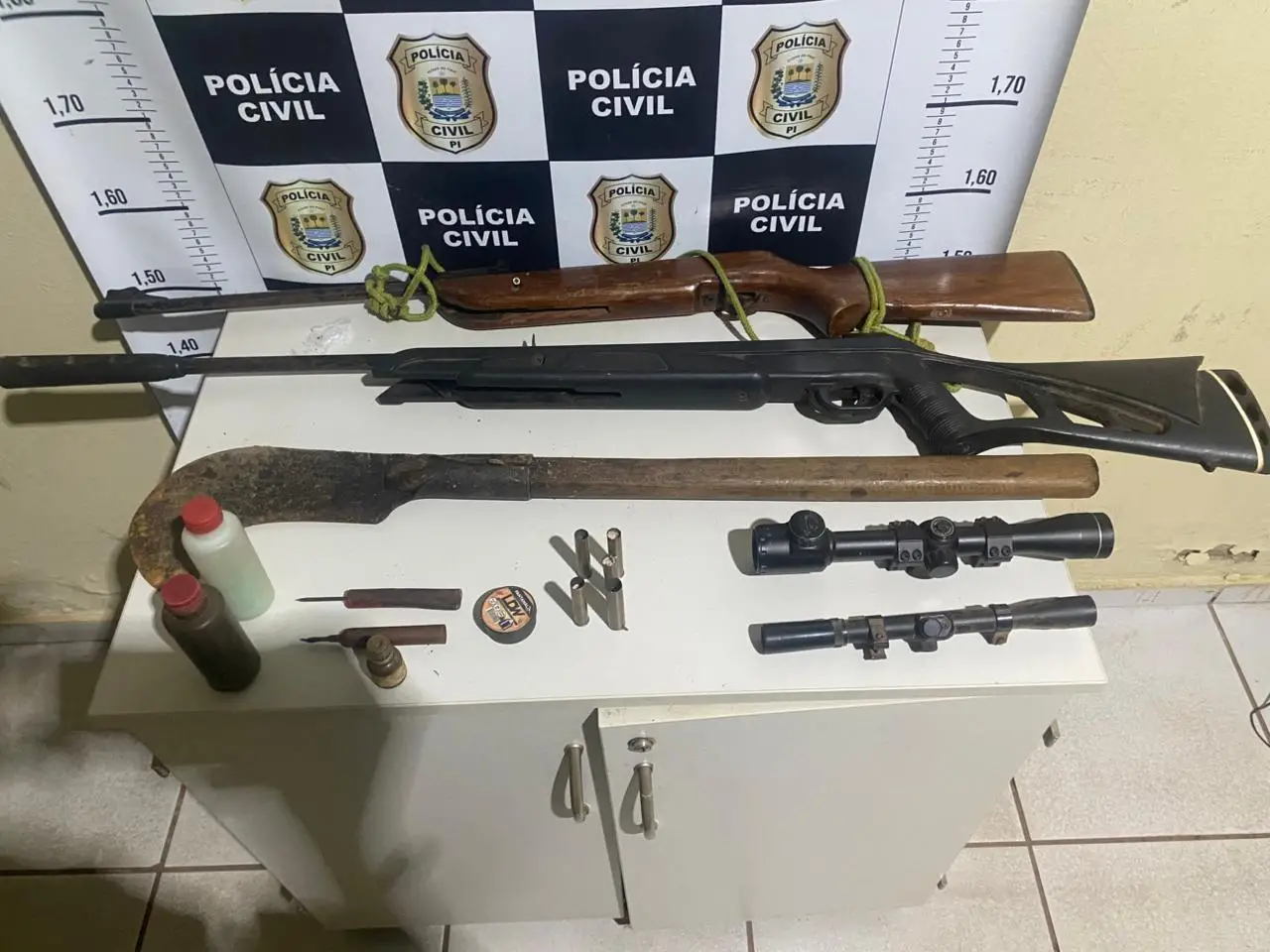 A polícia apreendeu ainda cinco cartuchos calibre 28 intactos, duas armas de pressão, pólvora, chumbo, espoletas e a foice utilizada no crime.