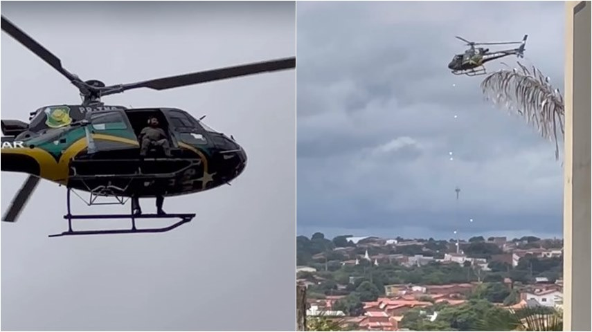 🚁 Na ação, ovos foram arremessados do helicóptero da corporação, que sobrevoou o bairro realizando manobras.