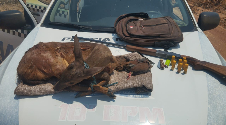 Dentro do saco, a cena era clara: um veado morto e duas aves da espécie lambu. Próximo ao local, também foram encontrados uma espingarda calibre 20 com sete cartuchos intactos, um isqueiro e um canivete.