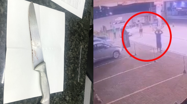 Ao se aproximar, constatou que populares tentavam conter um indivíduo armado com uma faca, enquanto outra vítima estava caída ao solo, apresentando intenso sangramento devido a um ferimento profundo na região abaixo do braço.
