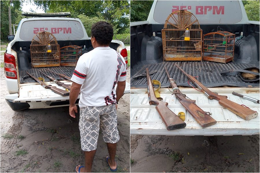 Com a autorização do suspeito, os policiais realizaram buscas no estabelecimento, onde encontraram três espingardas, uma delas de fabricação caseira, além de um punhal e dois pássaros silvestres mantidos em cativeiro sem a devida permissão.