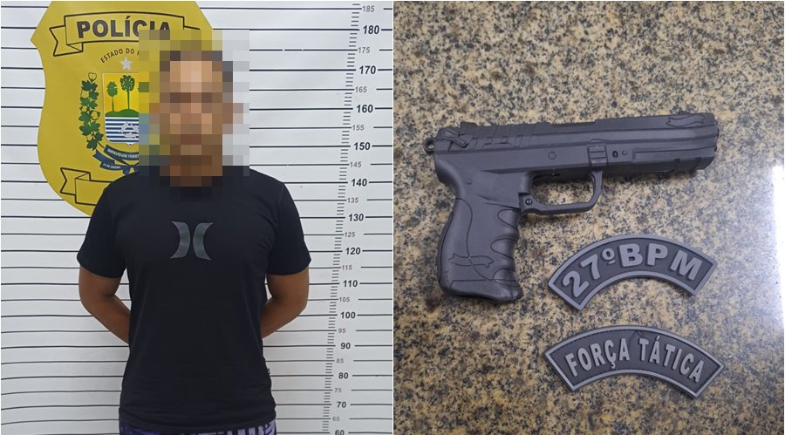 Ao chegarem ao local, os policiais encontraram o suspeito no portão da residência. Conforme o 27º BPM, ele arremessou o simulacro de arma de fogo no quintal, mas o objeto foi localizado e apreendido.