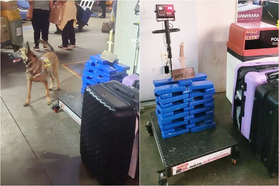 A cadela K9 Izzy, do Batalhão de Policiamento com Cães, localizou uma grande quantidade de maconha em duas malas que pertenciam ao acusado, que aguardava na área de embarque.