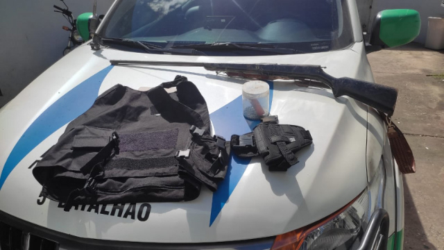 Após avaliar os relatos das vítimas e constatar a cena de violência no local, os policiais deram voz de prisão ao agressor por volta das 9h40. Durante os procedimentos policiais, a equipe conseguiu encontrar na residência do acusado uma espingarda de fabricação artesanal conhecida como "bate bucha", uma capa de colete balístico, uma porção de pólvora, um coldre, um colar de prata, uma porção de chumbo e um celular da marca "Motorola".