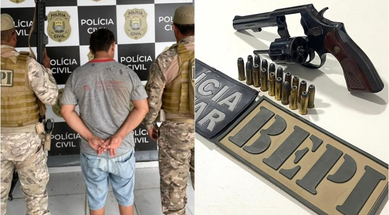 Suspeito preso e arma apreendida | Foto: Divulgação/PMPI