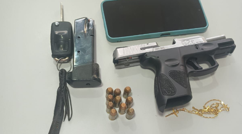 Ao chegar ao local, os policiais confirmaram a denúncia e apreenderam uma pistola Taurus G2C calibre .40, além de 10 munições e um carregador.