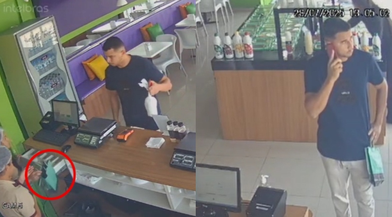 O assalto foi registrado por uma câmera de segurança do local. As imagens mostram que o suspeito chegou sozinho às 13h03, com um copo de açaí, que ele colocou no balcão como se fosse pagar.