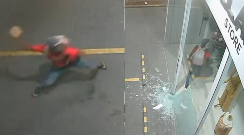 Nas imagens, é possível ver um homem usando boné tentando arrombar a porta do local com uma ferramenta não identificada e uma pedra. Ao não conseguir, ele se afasta e arremessa a pedra contra o vidro da fachada, que se quebra com o impacto. Em seguida, o suspeito entra na loja, pega dois notebooks que estavam sobre o balcão e passa a revirar gavetas e papéis, recolhendo outros objetos.