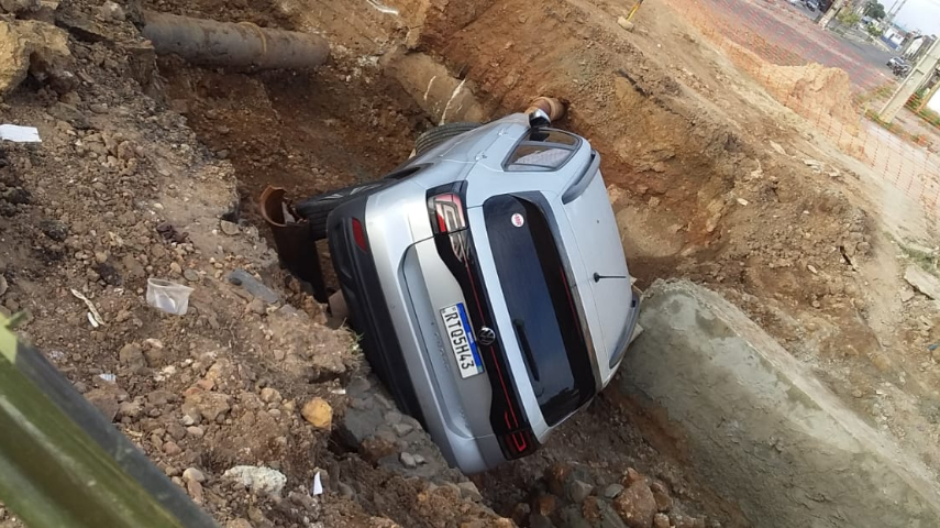O acidente ocorreu quando o motorista, aparentemente, passou direto pela via em obras, resultando na queda do veículo na área em construção. Até o momento, o veículo permanece no local do acidente.