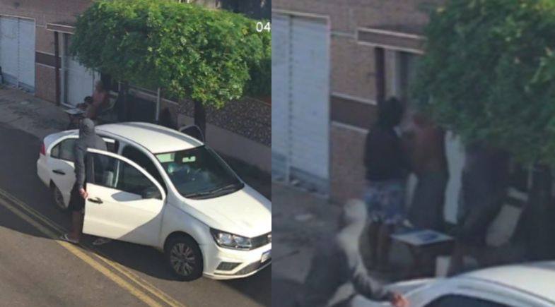 Por volta das 16h26, o idoso e a criança estavam sentados do lado de fora da residência. Momentos depois, um carro branco aparece, para em frente ao local, e os suspeitos descem usando capuz.