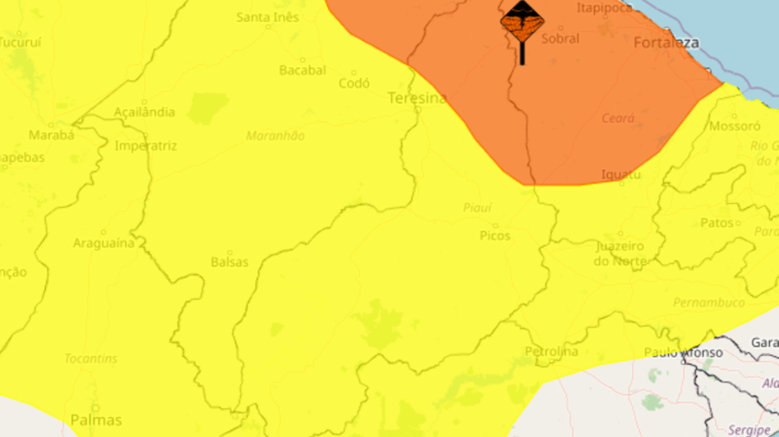 O primeiro comunicado climático (em amarelo) se estende mais pelas áreas do Sudeste, Centro-Norte, Sudoeste e Norte do Piauí.