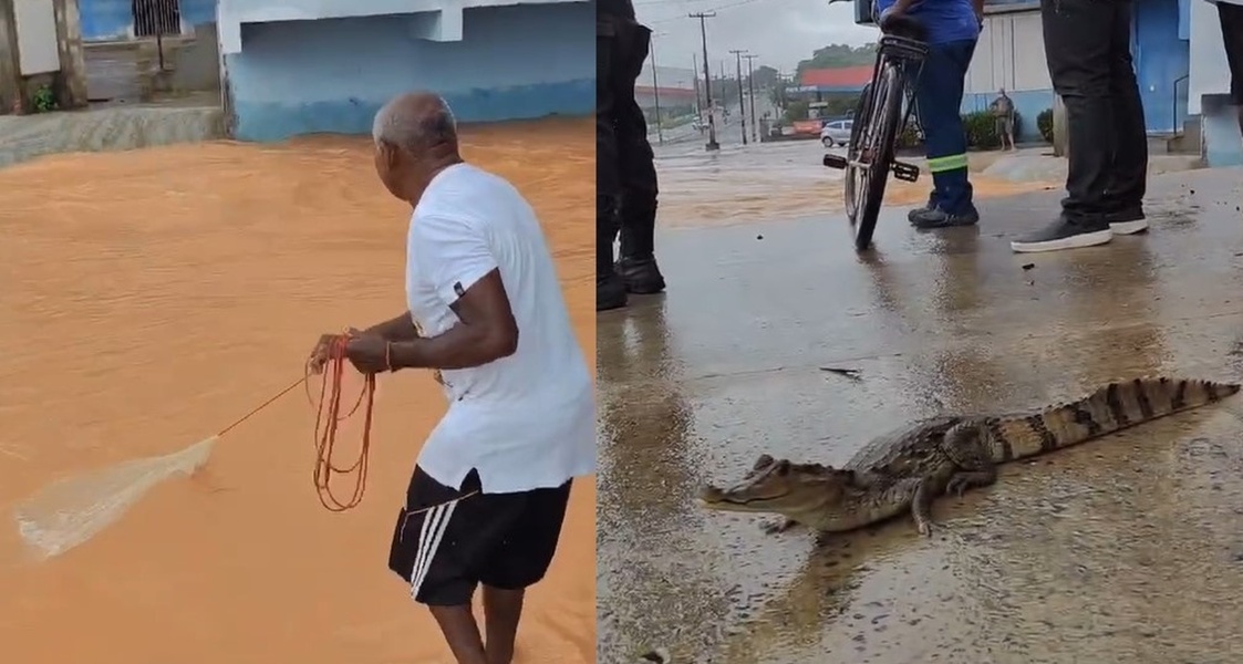 Populares registraram o momento, onde é possível ver um homem pescando na área alagada, enquanto um filhote de jacaré aparece próximo ao local. Os vídeo repercutiram nas redes sociais, e atraiu a curiosidade de quem passava no local.