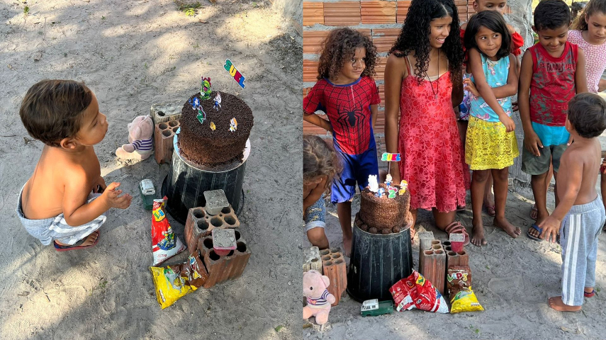 " No dia do aniversário dele eu fiquei bem triste por não poder ajudar, não poder fazer um bolinho para ele. Eu sei que eu faço o máximo como mãe, mas não é tudo o que a gente consegue. Eu pensei ‘ não vou conseguir fazer um bolo pra ele chamar os coleguinhas dele, puxa muito, eu vou na loja e vou comprar uma bicicletinha pra ele, pagar a prestação para ficar no lugar do bolo. [..] As meninas foram e disseram que iam fazer um aniversário pra ele. Quando foram me chamaram pra ver, eu achei tão lindo. A gente realmente fez o aniversário dele de bolo de areia”, disse Lucineide emocionada.