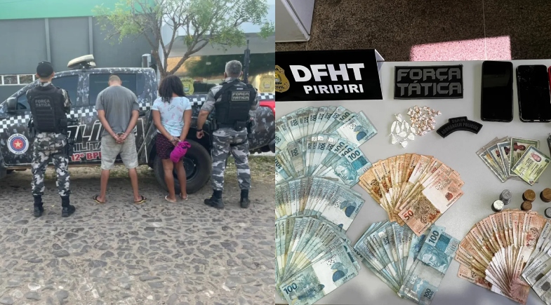 Os presos são um casal. Com eles, as equipes do 12º BPM encontraram 41 pedras de crack, 10 trouxas de cocaína, e R$ 12.800,00. Os suspeitos estão à disposição da Justiça.