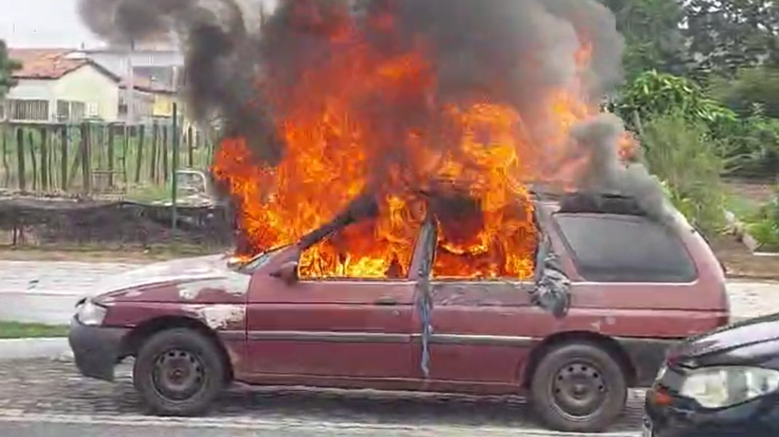 Na manhã desta terça-feira (23) um carro de modelo não identificado pegou fogo na Avenida das Hortas, nas proximidades de um posto de combustíveis no bairro Dirceu, zona Sudeste de Teresina. As imagens registradas por um popular que passava na região, mostram as chamas consumindo o veículo.
