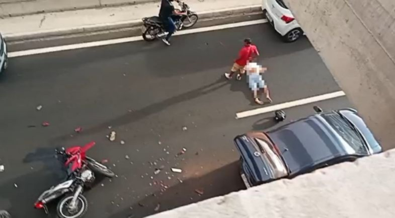 Imagens feitas por populares mostram a vítima caída ao chão, ao lado do capacete. O trânsito ficou lento na região durante o atendimento à ocorrência.