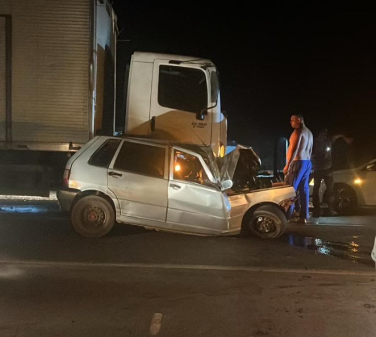 O acidente ocorreu próximo à Distribuidora Ideal Alimentos, conforme informações fornecidas pelos policiais. A PRF informou que o carro de passeio invadiu a faixa de sentido contrário e colidiu violentamente contra o veículo de carga.