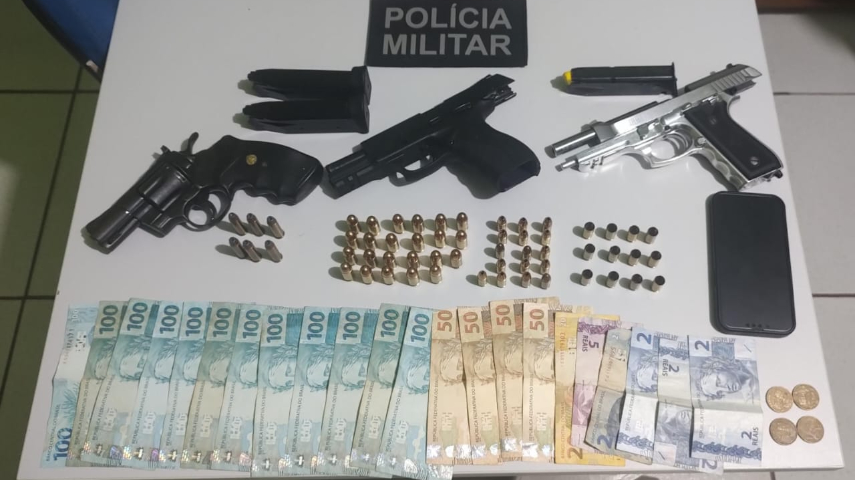 Em seguida, durante a busca veicular, foi encontrado em compartimentos do veículo 3 armas de fogo e munições, sendo uma pistola Taurus PT92, com 01 carregador; 16 munições calibre 9mm; uma Pistola Taurus 845, com 02 carregadores; 23 munições calibre 45; um revólver Colt 357 magnum e 06 munições calibre 357.