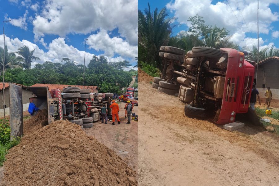 Uma caçamba carregada com areia tombou na manhã desta quinta-feira (6), no povoado de São Vicente, zona rural Leste de Teresina, deixando o motorista preso às ferragens do veículo. Ele foi resgatado com vida e consciente pelo Corpo de Bombeiros Militar do Estado do Piauí.