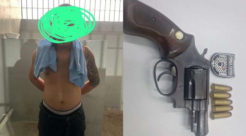 Com o suspeito, foi apreendido um revólver calibre .38, marca Taurus, com numeração raspada, além de cinco munições intactas. Durante a abordagem, o homem resistiu e precisou ser contido com uso de força moderada.