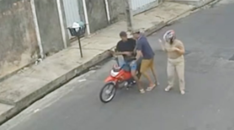 Dois criminosos armados tomaram de assalto a moto de uma mulher na tarde deste sábado (27), no Parque Itararé, zona Sudeste de Teresina. Uma câmera de segurança flagrou o momento em que a dupla aborda a vítima e foge com o veículo.