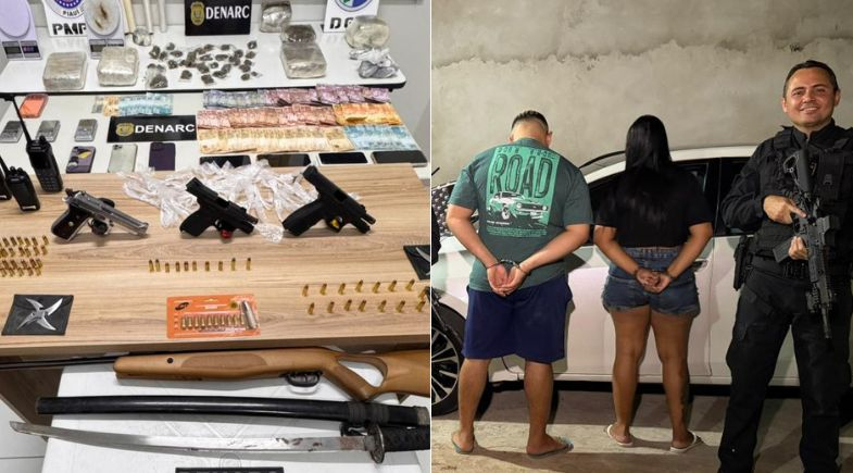 Durante a abordagem policial, um homem tentou descartar o celular. Segundo o delegado Charles Pessoa, coordenador do Departamento de Repressão às Ações Criminosas Organizadas (DRACO), ele e a companheira dele, que trabalhava como manicure, são suspeitos de atuar na venda de drogas e de integrar a facção criminosa Bonde dos 40.
