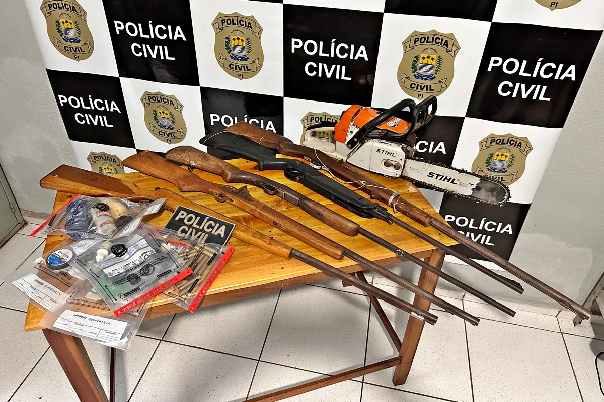 Uma operação da Polícia Civil do Piauí, em Cocal e Granja (CE), prendeu dois homens e apreendeu cinco espingardas e apetrechos para o preparo de munição. Os suspeitos foram identificados como João Antônio Correia, de 66 anos, e José Gomes de Sousa, de 59 anos. A ação ocorreu na tarde desta quinta-feira (19).