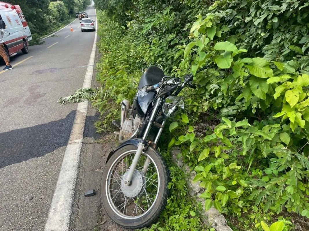 PERIGO NA RODOVIA - A motocicleta ficou bastante danificada devido ao impacto da colisão. A região onde ocorreu o acidente é conhecida pela frequente presença de animais na pista, que já resultou em outros acidentes.