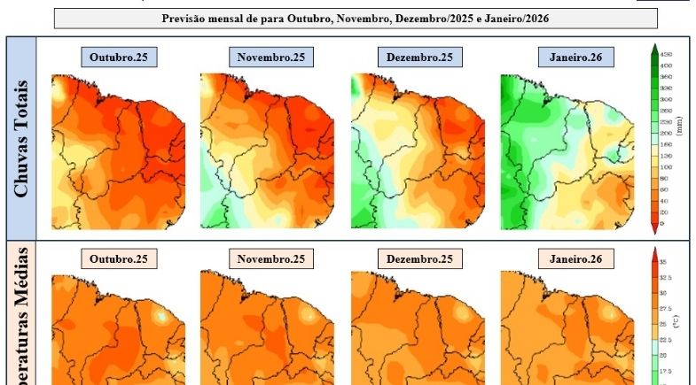 A partir de dezembro, o cenário muda com o avanço das instabilidades que provocam chuvas que devem trazer volumes maiores: 200 a 230 milímetros no sul e até 160 milímetros no norte e centro do Piauí. Só em janeiro, já com a mudança de estação, as chuvas se espalham por todo o estado, com médias que podem alcançar 260 milímetros.