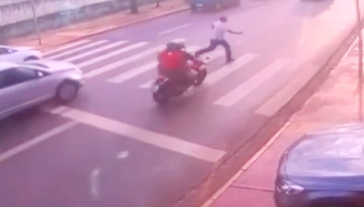 Câmeras de segurança de um estabelecimento registraram o momento em que ele atravessava a via pela faixa de pedestres e foi atingido. O motociclista e a passageira foram socorridos com ferimentos leves e levados para um hospital.