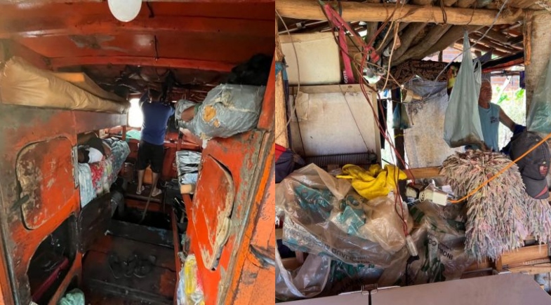 Quanto aos pescadores, a situação era semelhante. O alojamento disponível no barco era um pequeno cubículo sem ventilação, com colchões rasgados, e as beliches instaladas no mesmo espaço do motor da embarcação. Sem banheiros, os trabalhadores teriam que fazer suas necessidades em mar aberto, assim como o banho que teria que ser feito com a água do mar. A alimentação era precária – arroz, feijão, macarrão e parte do peixe que seria pescado durante o trabalho. A água para beber e cozinhar era armazenada em tambores plásticos reaproveitados.