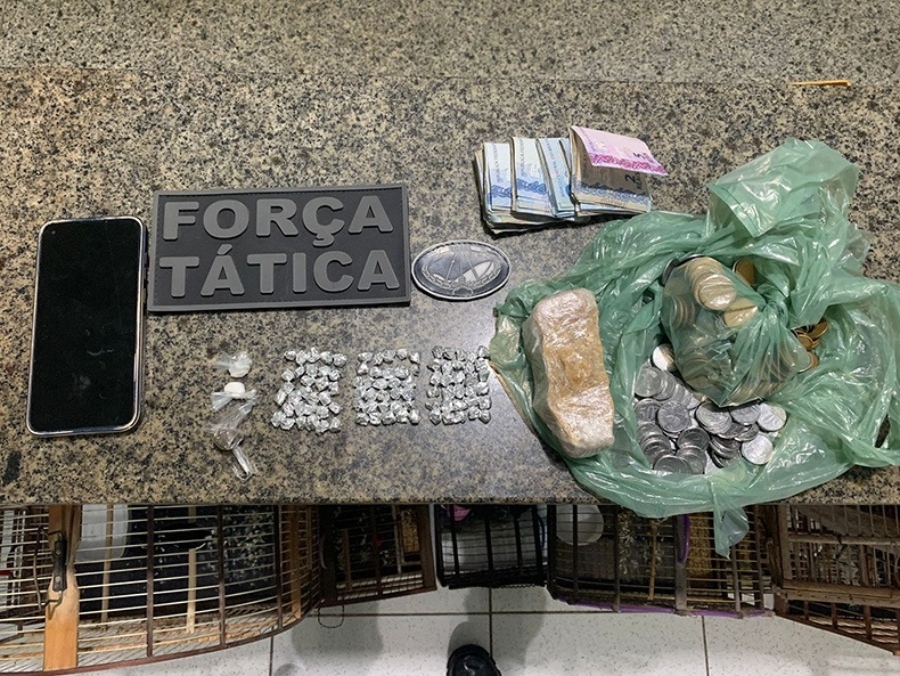 O QUE FOI APREENDIDO – Durante as buscas feitas na casa abandonada que era usada como ponto de venda de drogas, foram encontradas 90 pedras de crack, 01 porção grande de crack, 02 invólucros de cocaína, 01 porção de maconha, R$ 244,30 em espécie e pássaros silvestres em gaiolas.