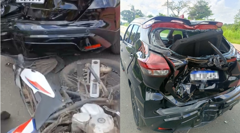 Nesse momento, o PM vinha logo atrás, conduzindo sua motocicleta, e colidiu violentamente contra a traseira do carro. Imagens feitas no local mostram que o veículo ficou parcialmente destruído devido ao forte impacto. O vidro ficou estilhaçado.