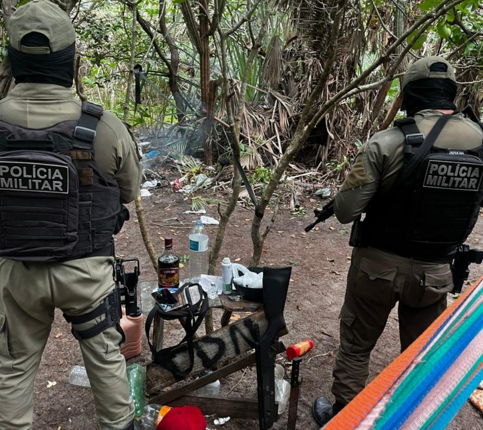 No local abandonado, os militares encontraram redes, uma bolsa contendo R$ 55,10 em dinheiro, um aparelho celular e uma arma de fogo de fabricação artesanal. Todo o material foi recolhido e apresentado conforme protocolo da corporação.