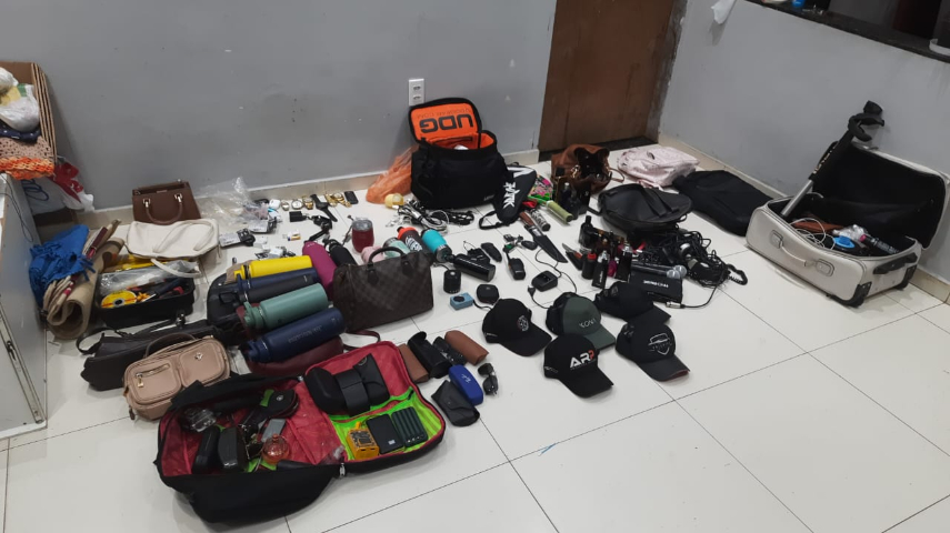 Dentre os objetos apreendidos estão um rádio HT, uma bolsa térmica com medicamentos diversos, uma maleta plástica com ferramentas, várias bolsas femininas, quatro chaves de veículos, 12 garrafas térmicas, três controles remotos, relógios de marcas diversas, uma coifa de ilha, diversos fios e cabos de aparelhagem de som, vários carregadores de celulares, fones de ouvido, 24 frascos de perfumes de marcas diversas, duas raquetes de Beach Tennis e dois microfones.