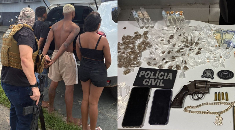 De acordo com a Polícia Civil, uma mulher identificada pelas iniciais P.F. da S. e um homem identificado como F.G.P.S.C. foram autuados pelos crimes de tráfico de drogas, associação para o tráfico, corrupção de menores e posse ilegal de arma de fogo. Um adolescente que estava no local também foi conduzido à delegacia.