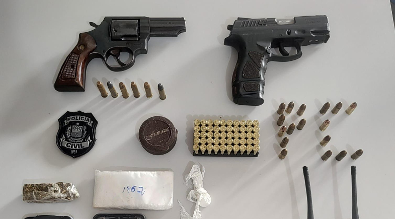 No local da operação, os policiais civis apreenderam um vasto material ilícito, incluindo uma arma de fogo calibre 9mm com numeração suprimida, um revólver calibre .38, munições, entorpecentes, rádios comunicadores, aparelhos celulares e veículos com indícios de adulteração, além de outros objetos utilizados em atividades criminosas.