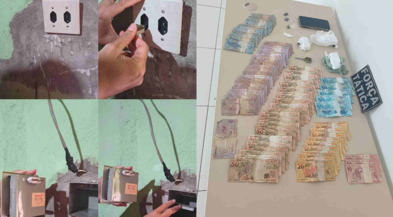 A guarnição se deslocou até o endereço informado e, após buscas, encontrou mais porções de cocaína, três trouxinhas de maconha, um smartphone, uma chave para abertura do compartimento secreto e R$ 2.050,00 em dinheiro trocado.