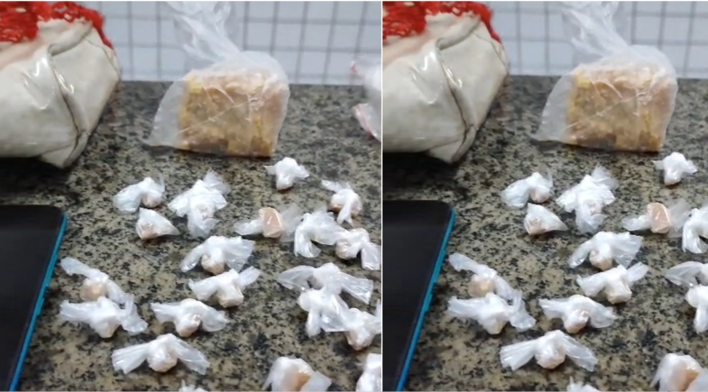 Ao perceber a aproximação da viatura, Teresa tentou descartar um objeto em um terreno baldio. Após buscas na área, a guarnição encontrou duas pequenas bolsas contendo drogas.